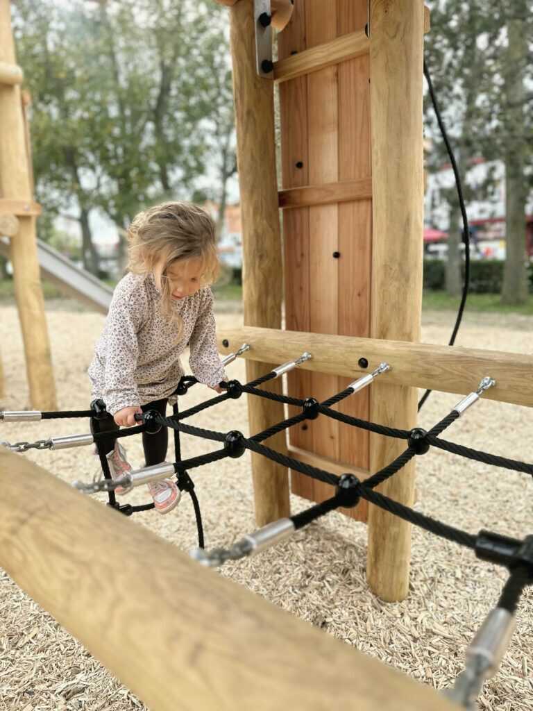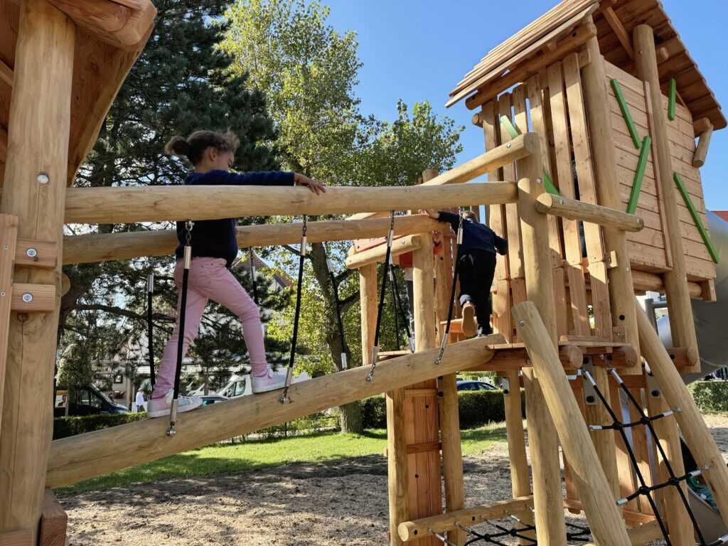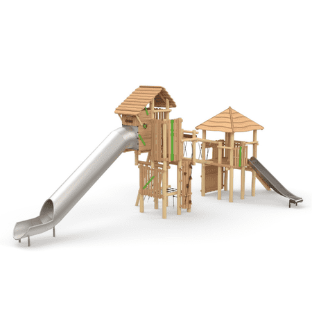 מתקן משחק משולב מעץ רוביניה הכולל מגדל מרכזי עם גג עץ, מגדל נוסף מחובר באמצעות שביל איזון, קיר טיפוס, רשת טיפוס, עמוד גלישה ומגלשה ישרה מנירוסטה. מתחת למגדל משולב אזור שהייה המאפשר ישיבה ומפגש.המבנה הרב־מפלסי מייצר רצף תנועתי בין טיפוס, מעבר וגלישה, ותורם לפיתוח שיווי משקל, קואורדינציה וחיזוק חגורת הכתפיים. מתאים לשילוב כמתקן מרכזי במתחמי משחק לגנים ציבוריים , מוסדות ופארקים.