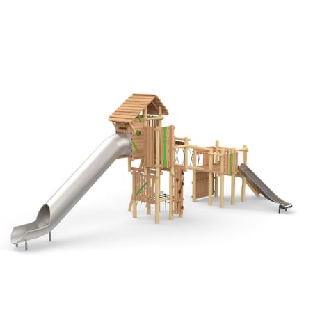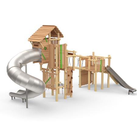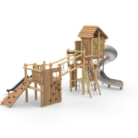 מתקן משולב "מבצר האבירים" מעץ רוביניה + מגלשה ספירלית מנירוסטה